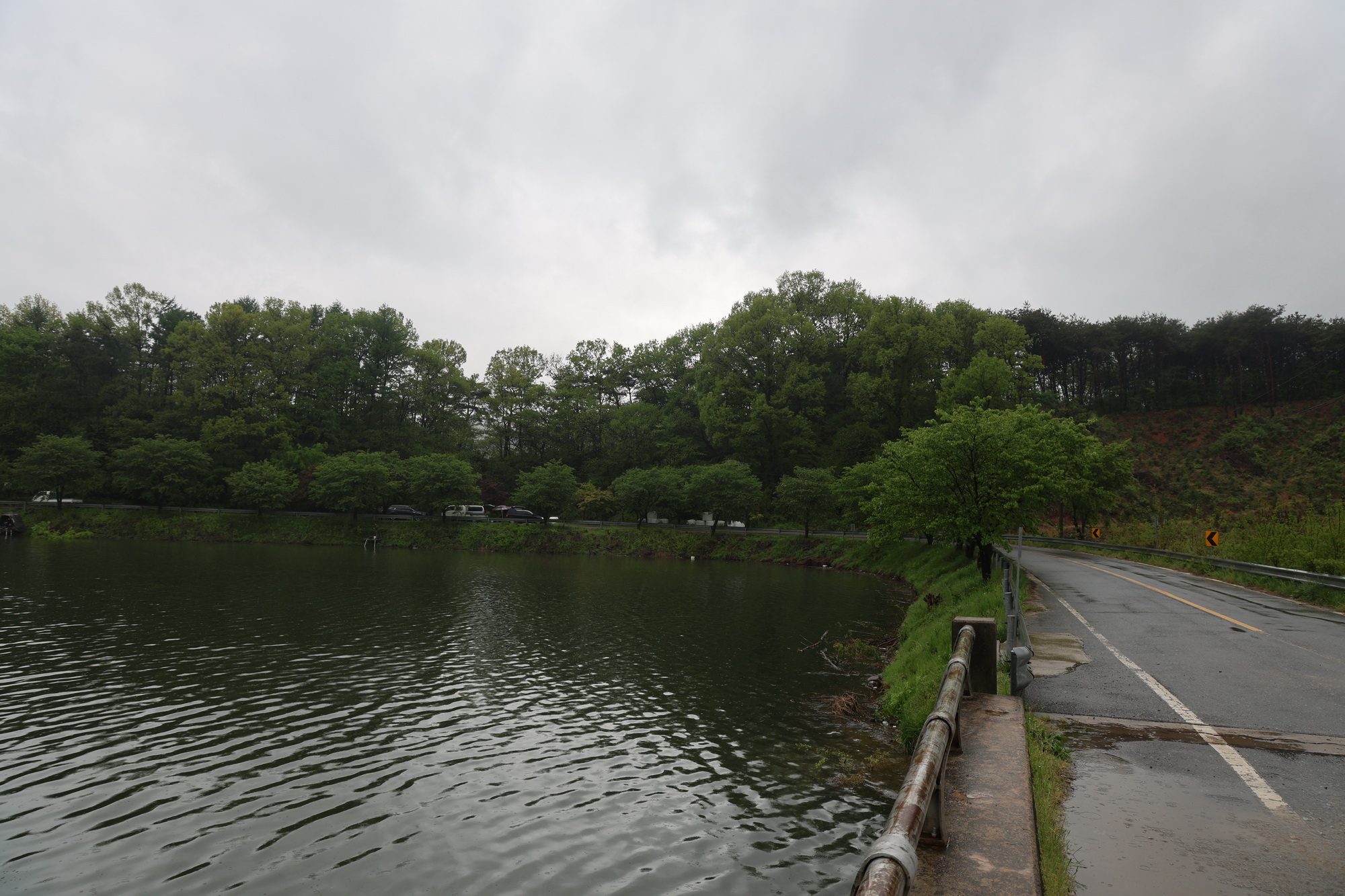 비가 오는 날에도 낚시를 하러 온 사람들이 적지가 않았습니다. 이 저수지는 천태산에서 흘러내린 물이 고여 저수지를 이루어서 천태저수지라고도 하며 행정리에 위치하여 행정저수지라고도 부릅니다.